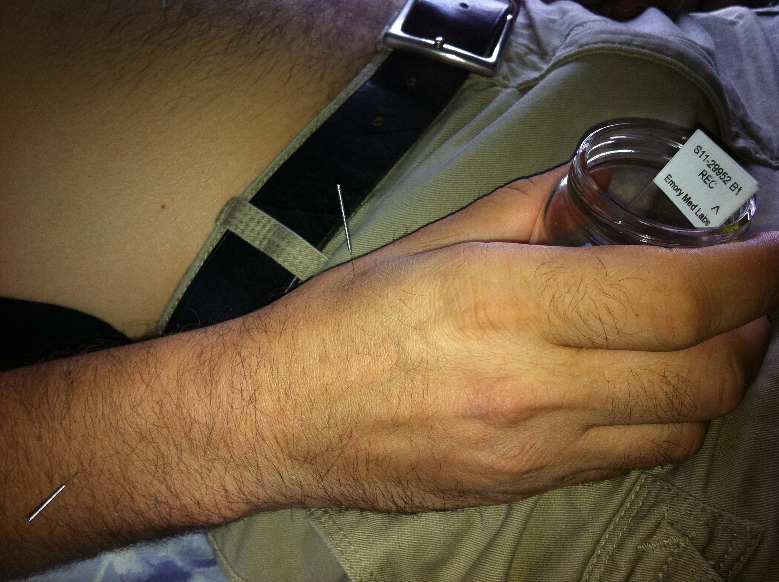 The information gathering described above allowed Lisa to decide how to treat me with needles. She had me hold in my right hand a jar containing the tumor slide and a vial of something that she did not tell us what it was and we did not ask. She put about 20 needles in me from head to toe, which didn’t hurt at all, and asked if I felt any energy movement. I didn’t feel a thing (and didn’t expect that I would). She dimmed the lights, put on some new age music and left the room for twenty minutes. Well it wasn’t too long before a felt something at one of the needle points in my right leg. It was a vibration that lasted about a half a second and repeated every second. It felt circular, like the needle was spinning although I didn’t look to see. Then I noticed a couple other sensations, one in my other leg, one at the crown of my head. Who knows, maybe we unblocked some energy channels.
