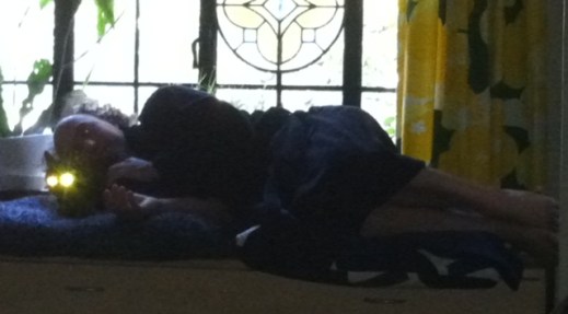 The photo for this post is of me lying with my head on my cat, Mila. It looks like my radiation has lit up her eyes.
