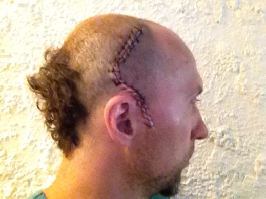 The operation took about an hour and a half. I’m told Dr. Olson did consult with me after but I don’t remember it (too doped up). What they removed was 80% tumor and 20% necrotic tissue. A post-op MRI was done, but we have not had the chance to review it yet with the doctors. It’s possible that they didn’t get it all. Also, they cut along the same line as before. They just used sutures rather than staples this time.