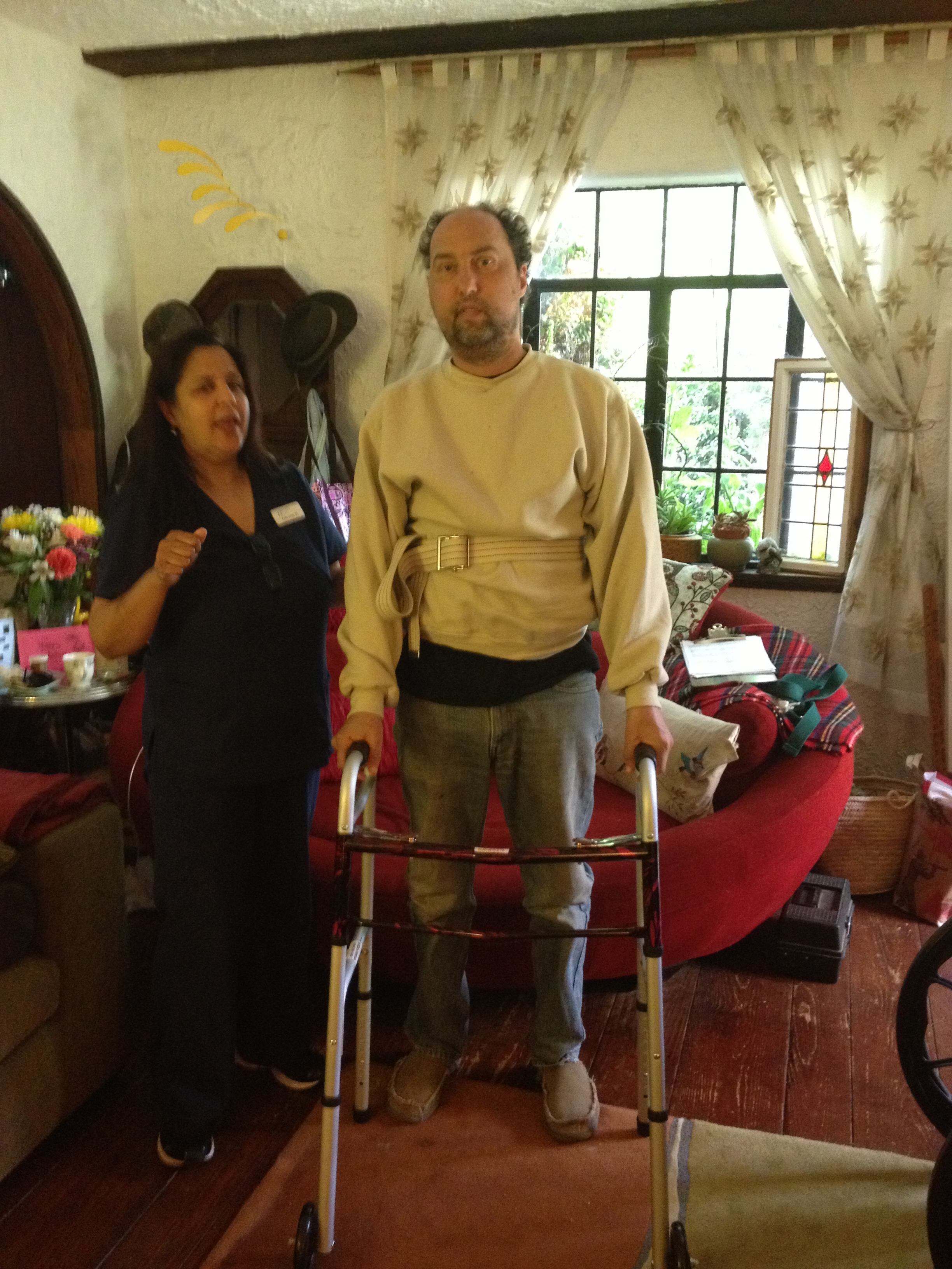 We finally got a visit from a physical therapist to explain how to use some of the equipment, i.e., walker and cane, and she also gave me exercises.
